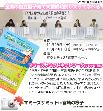 マミーズサミットの歴史 マミーズサミット 第16回マミーズサミット in 宮崎 2009年11月28日 第16回マミーズサミット in 宮崎(2009年11月28日開催)「どげんかせんといかん日本の子育て」 Facebook postLINE